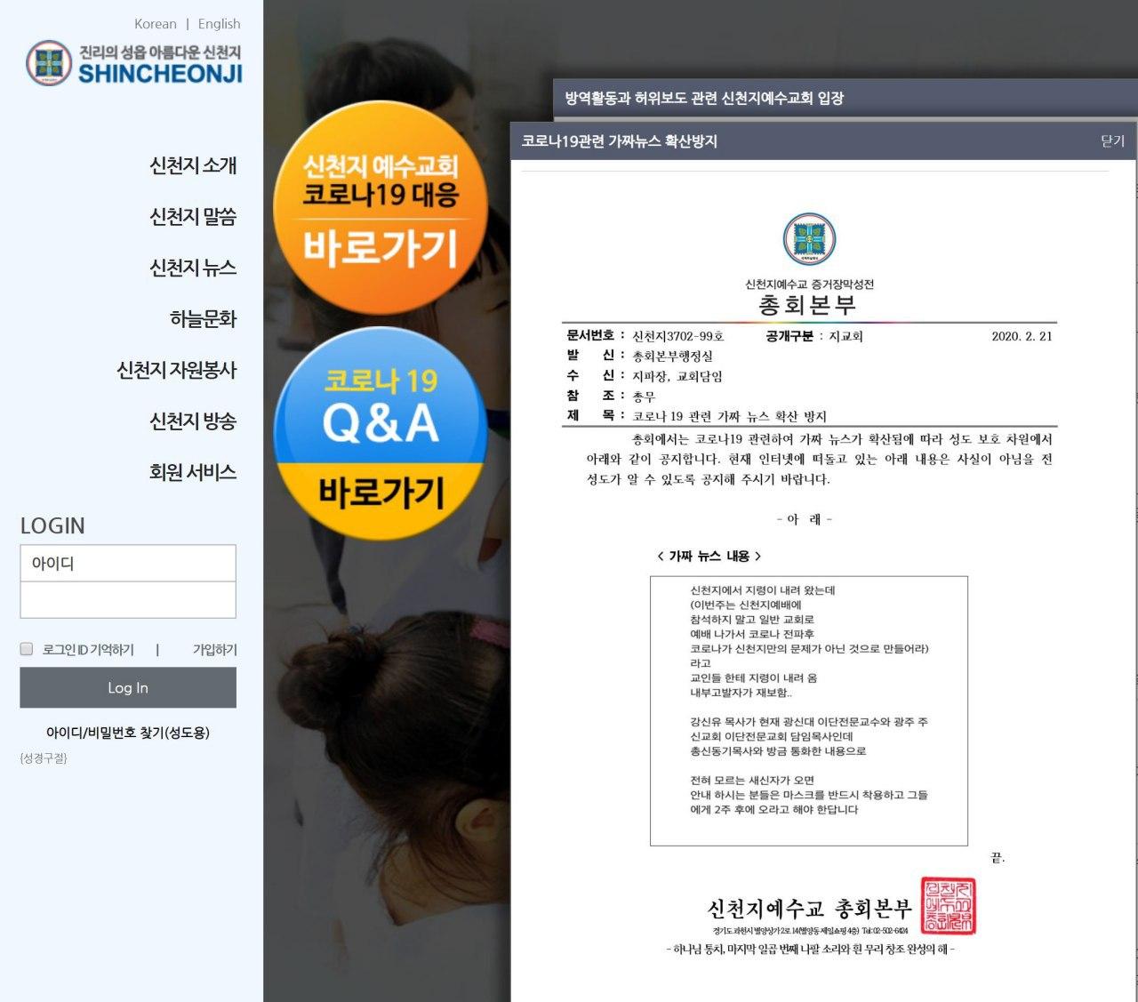 유포되고 있는데 신천지예수교회 코로나19 Q&A 게시판을 통해