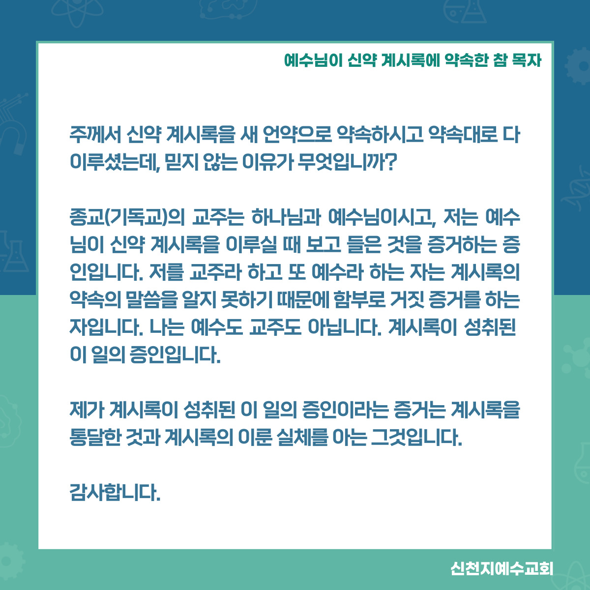 안녕하세요! 신천지 예수교회입니다. 한 번만 들어보셔도 최고라고 여기실 만큼 최고의 진리를 배울 수 있는 기회입니다. 세계 최고의 성경교육 강사진을 통해 성경의 기초 상식부터 요한계시