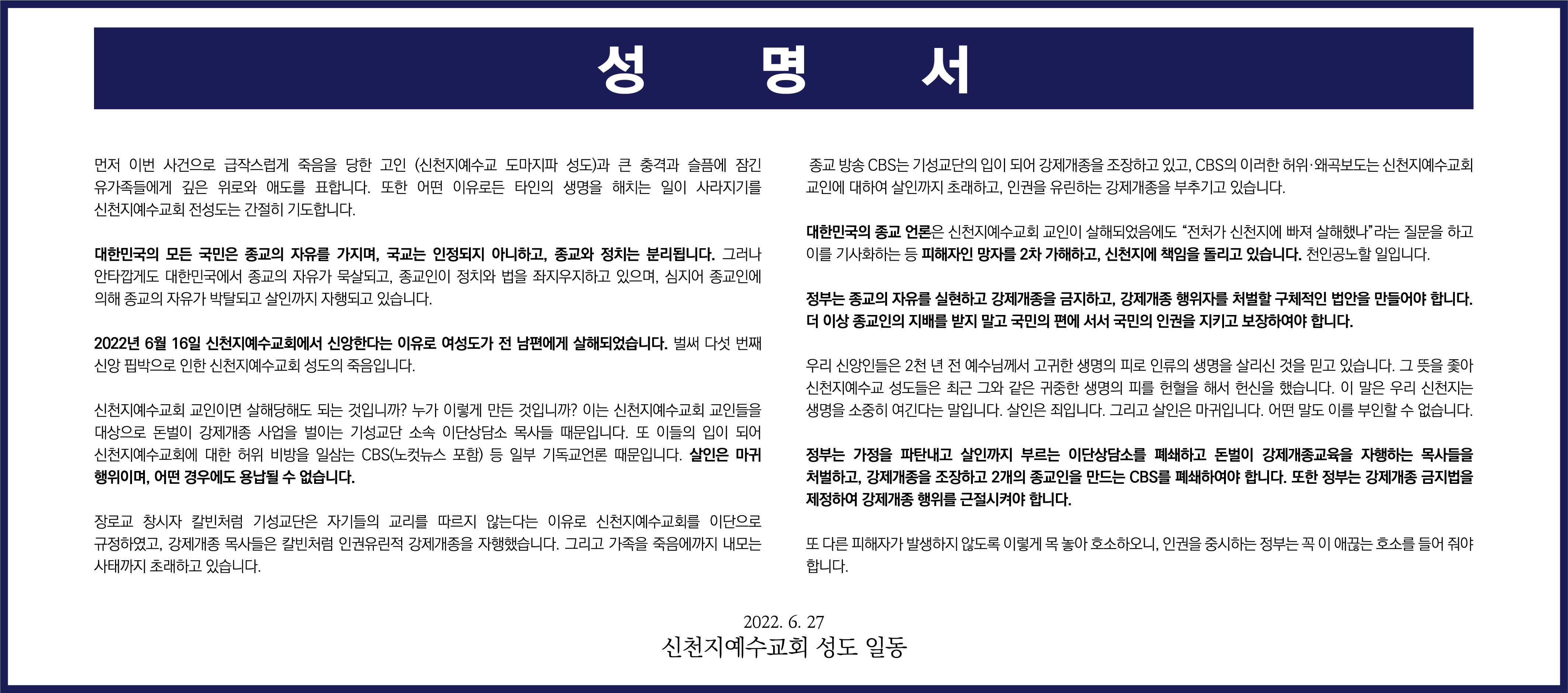 이에 신천지 예수교회는 ‘성명서’를 발표하였습니다.