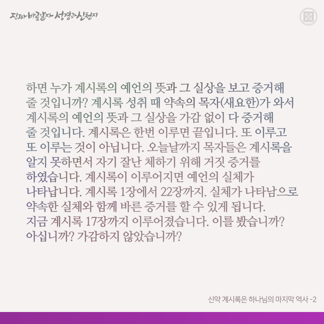 전 세계 누구도 풀지 못한 요한계시록의 예언과 그 이루어진 실상을 증거한다(계 22:8, 16)